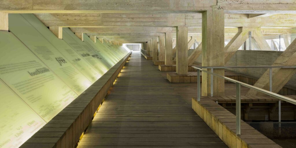 Then comes the descent. The visitor moves beneath the quay, into a concrete chamber both austere and luminous in its simplicity, yet dark, almost sepulchral, in its intent. The murmur of the river can be heard and light filters through like that in the hold of a slave ship. A faint soundtrack whispers. The space closes in; time seems suspended. To one side, an opening faces the Loire; to the other, a glass wall engraved with the word Freedom in forty-seven languages. A polyphonic chorus of voices rises, solemn and resonant, along this wall. They speak the unspeakable — of struggle, of hope, of revolt. From the words of enslaved insurgents to the speeches of abolitionists; from Enlightenment philosophers to twentieth-century poets; from the calls of past resisters to the appeals of today’s activists.
