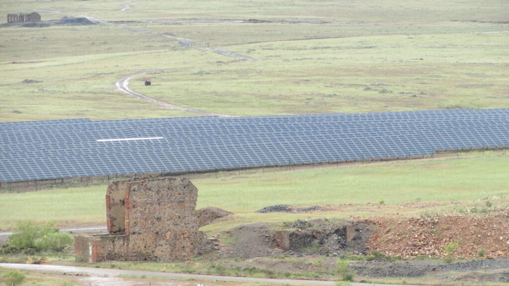 Winding tower of La Gamonita mine and, in the background, part of the photovoltaic installation. Photograph: AMECADEC
